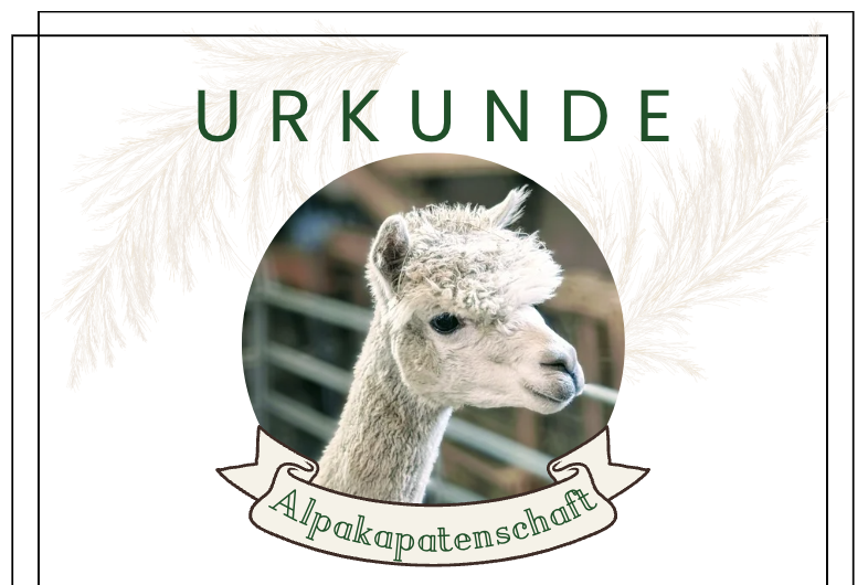 Eine Alpakapatenschaft vergrößert Deine Urkundensammlung, verpflichtet Dich aber zu nichts. Sie dient als Finanzspritze für Futter, Pflege und – hoffentlich nicht so oft notwendig – Tierarzt. Ein Jahr lang darfst Du Dich aber mit dem Titel „Alpakapate“ schmücken und Du wirst auf Wunsch namentlich auf unserer Webseite erwähnt. Selbstredend gibt es dafür eine Urkunde (sonst glaubt einem das vielleicht niemand) und als Dankeschön ein gegossenes Alpaka aus unserem Fensterlädchen sowie einen Spaziergang.
